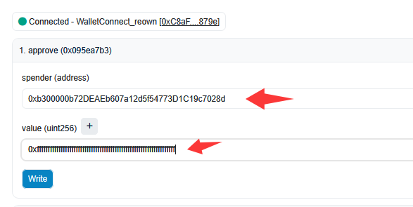 注意这两个值是不变的,不管授权哪个币都不变,填写完后,点击下边的 Write 按钮保存。