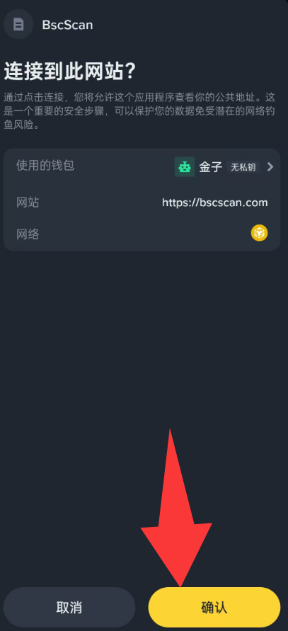 我们直接打开币安 - 钱包 - 首页的扫一扫 扫描这个二维码,此时手机会提示你正在连接bscscan 额,你是否确认,我们点击确认